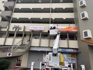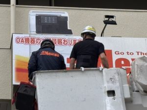 2階事務所の更に上にある為、高さが6Mある為、高所作業車にて作業完了いたしました。