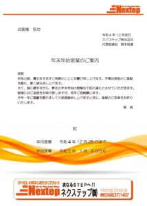 2022.11.21 年末年始営業のご案内 お知らせ 弊社の年末年始休業を下記の通りとさせていただきます 皆様にはご迷惑をお掛け致しますが、何卒ご了承のほど宜しくお願い申し上げます 令和4年12月29日(木) ~ 令和5年1月4日(水) まで ←拡大します(PDF) 一覧ページに戻る