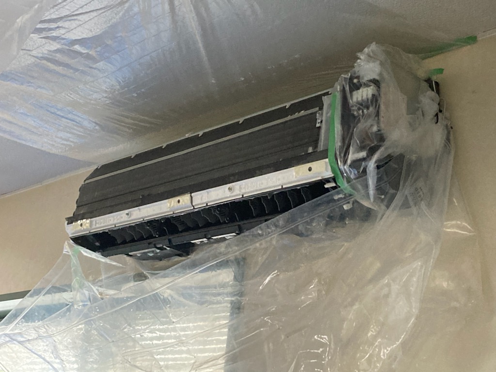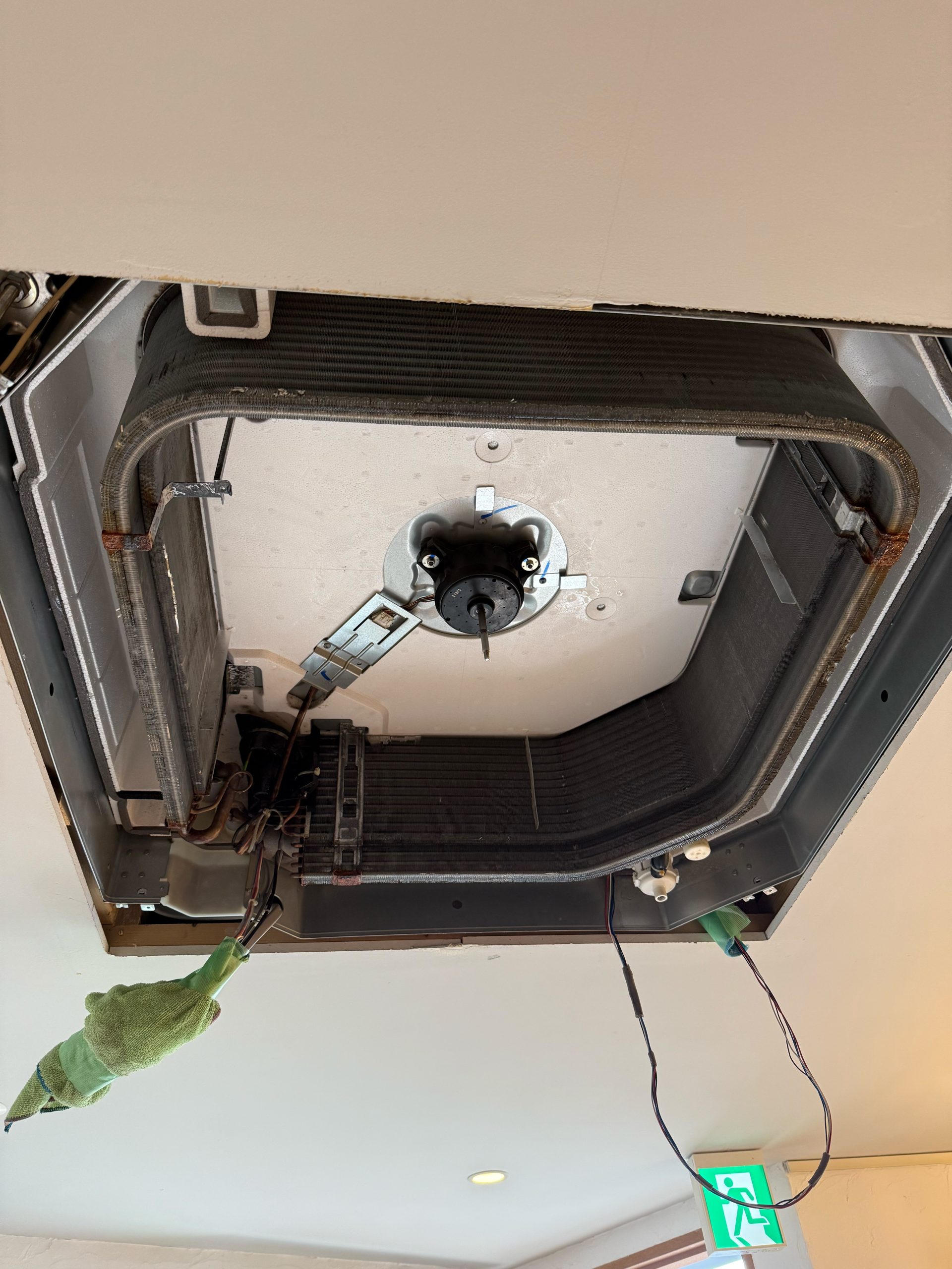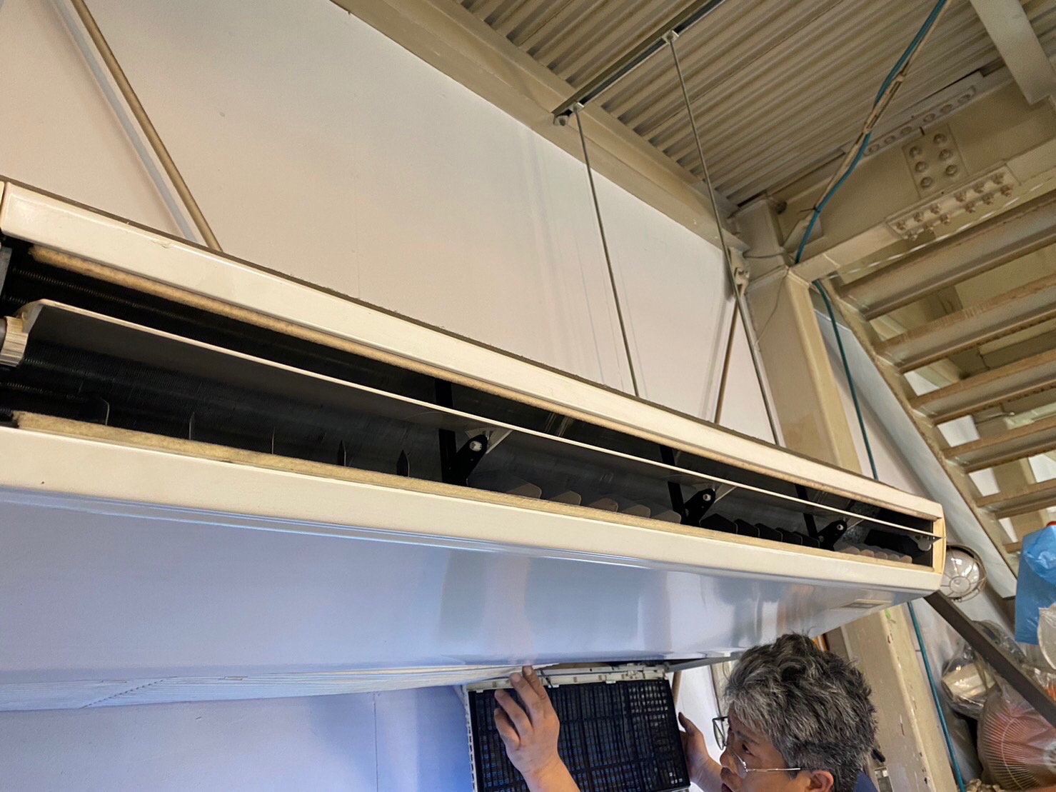 工場内のかなり古いエアコンを清掃いたしました。 エアコンの下に工作機械があり足場を組んでの作業。 無事にクリーニング完了し、大変お喜びいただきました。 さあ、芯から冷え込む寒―い季節がやってきました。 暖房をフル活用して業務効率向上です!