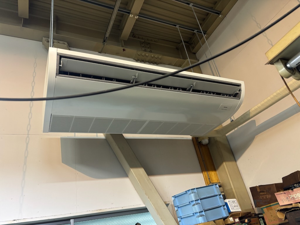 永年ご利用された工場内エアコンの取り換え工事を行わさせていただきました。 ネクステップDMのエアコン工事チラシをご覧いただき、お問い合わせを頂きました。 設置高が高い為、取り外し、取付と丸二日かかりました。またお客様のご要望にて 旧機の取付位置から違う場所に取り付けにつき四人がかりの作業となりました。 「価格的にも取付位置的にも電力的にも大変満足です!明日からの作業が楽しみです」 とご満足いただきました