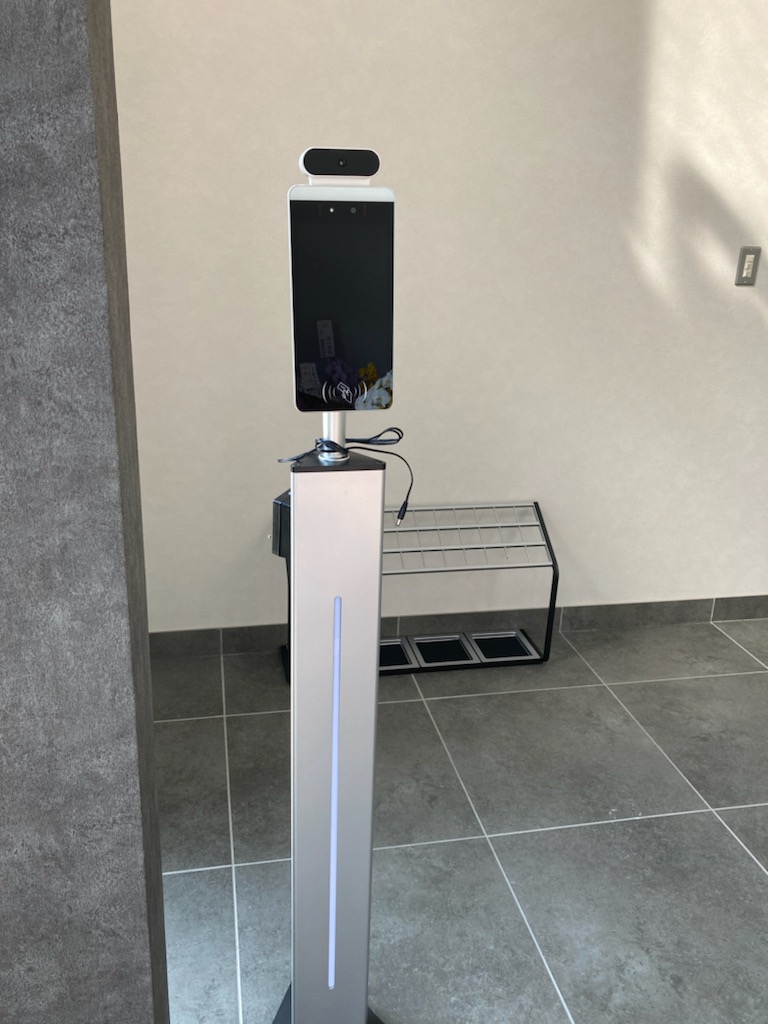 コロナ禍に伴い、出入り時に常に体温と人物特定・服装・時刻 を記録しておきたいとの要望で、 サーマルカメラを導入させて頂きました。 空港などで設置されているタイプと同様、通行人を常に測定します。