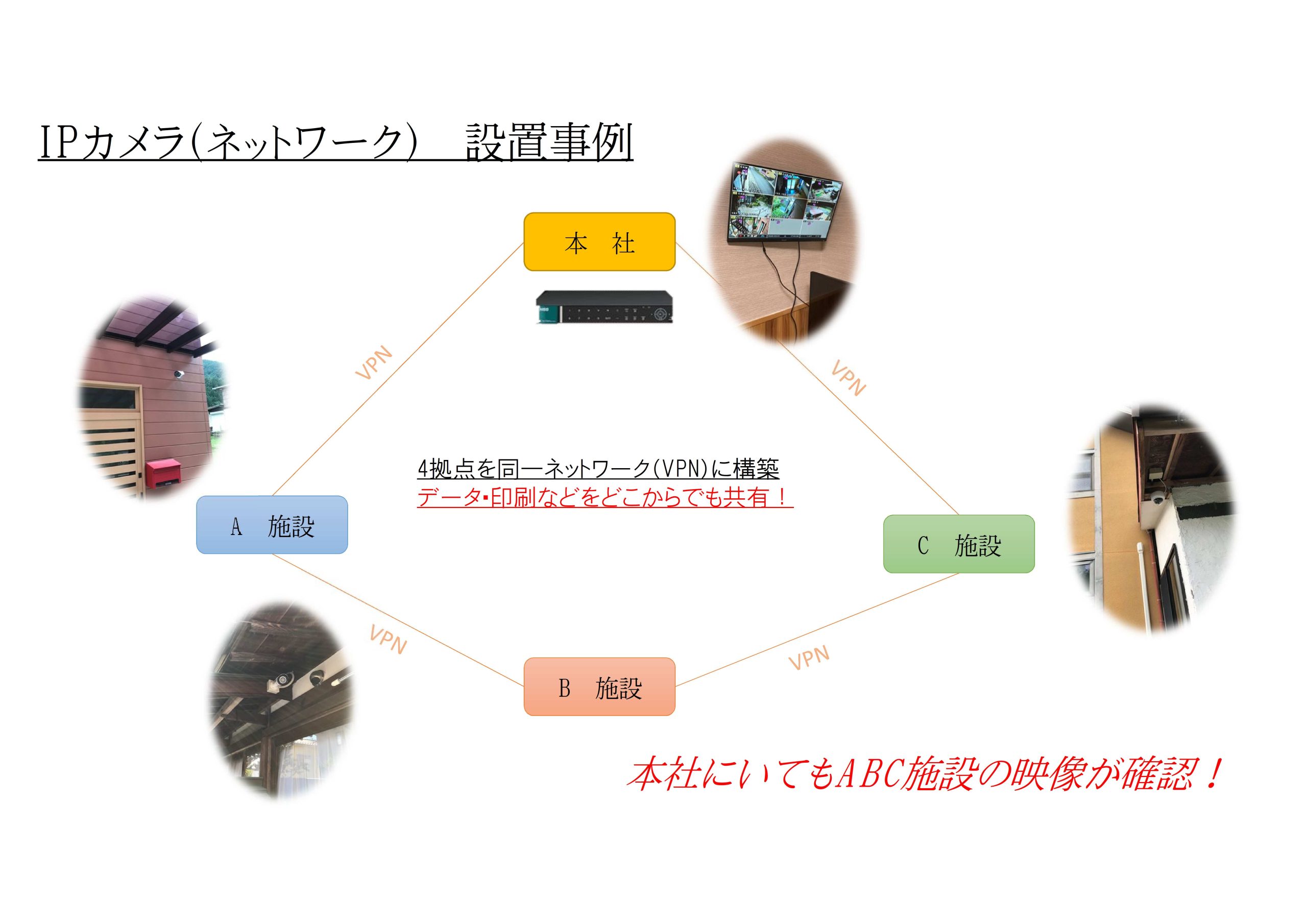 IP(ネットワーク対応)防犯カメラ 設置事例 本社と支店がある企業様、また、会社の防犯カメラの映像を自宅から確認したい。。。 実は写真のように、ネットワークをVPN(拠点間通信)で1つにまとめる事が可能です! どこからでも映像の確認ができ、また、カメラだけではなく、データや印刷などの作業も 共有することが可能です! まだ導入をされていない、検討はしているがイマイチわからない方、 是非お問い合わせお待ちしております! お見積りは無料ですのでお気軽にお問い合わせください!