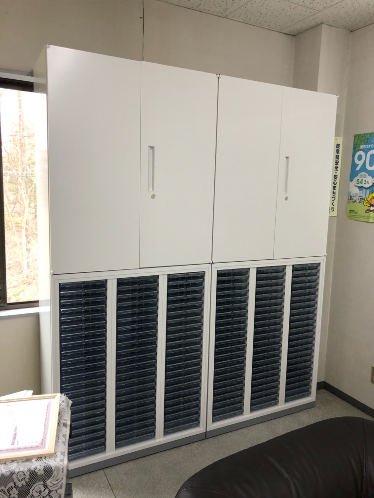 事務所のレイアウト変更に今回イナバブランドのホワイトの書庫を購入頂きました。 事務所の雰囲気が明るく見えます。