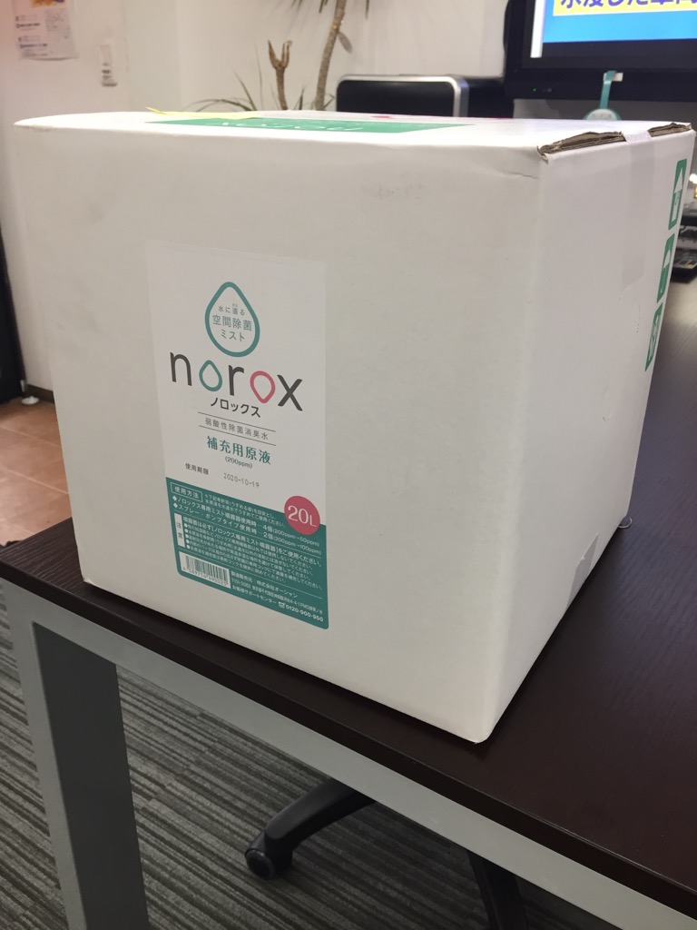 この度、社内福利厚生及び来社お客様のために除菌噴霧器「norox」を ご採用いただきました。 早速20リットル次亜塩素水のご注文をいただきました。 1日8時間噴霧したとして4倍希釈していただき約2か月分となります。 きたるべくインフルエンザに備えて皆様元気に頑張りましょう!!
