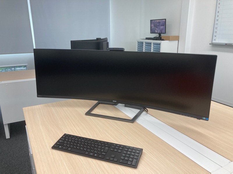 この度、49インチ32:9の大型モニターを2台ご導入頂きました。 フルサイズの2台の高性能ディスプレイを1つにしたような製品でUSB-CやWindowsHello対応のWEBカメラなど標準搭載 作業効率も上がりそうと大変お喜び頂けました。