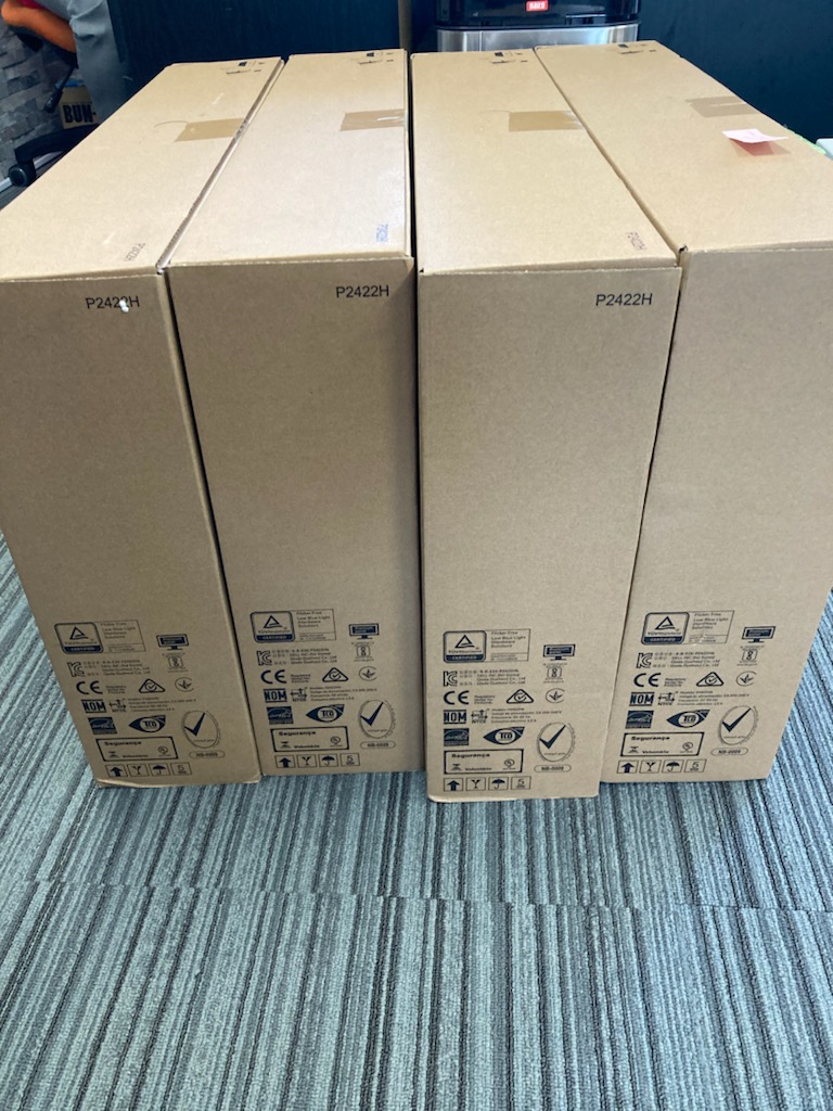 学科共通室内のモニターを一掃されたいとのご用命を頂きました。24インチモニター4式。 しかしながら、昨今の半導体不足の影響がモニターにも出てきており、納期不明や在庫なし等々で大変な状態です。 また価格もどんどん高騰してきており、機種選定に非常に困りました。 今回はDELL製品にて納品です