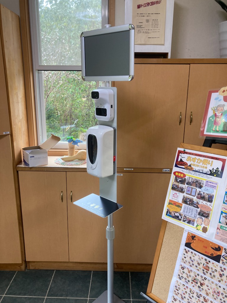 この度、ディスペンサースタンドを各施設9台導入頂きました。今まではハンディータイプの体温測定で保護者の方にもお待ちいただいていましたが、今回から自動体温測定、自動アルコールに成り非接触で今までのような待ち時間や接触もなく大変お喜び頂きました。