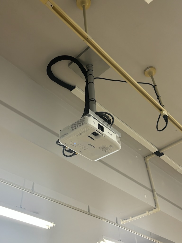 会議室内に於ける天吊りプロジェクターの取り換え工事の ご用命を頂きました。 しかしながら、現有機が10年以上前の古い機種である事とと 天井高が非常に高く、更に社外品取付金具で取り付けてあると非常に 厄介な工事となりました。 現状プロジェクターを一旦取り外し、取付金具も外して金属ドリルにて 別途穴あけ加工実施 無事に取り付け完了いたしました。投影位置調整、台形補正等々の画質調整も 終わり工事完了です。高所用脚立を買っておいて正解でした。