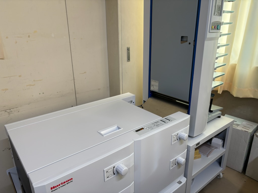 永年ご使用いただきました中綴じ折機を入替いただきました。 一度でホチキス止めをし小冊子ができ色々な資料を分速33枚 で作成可能です。