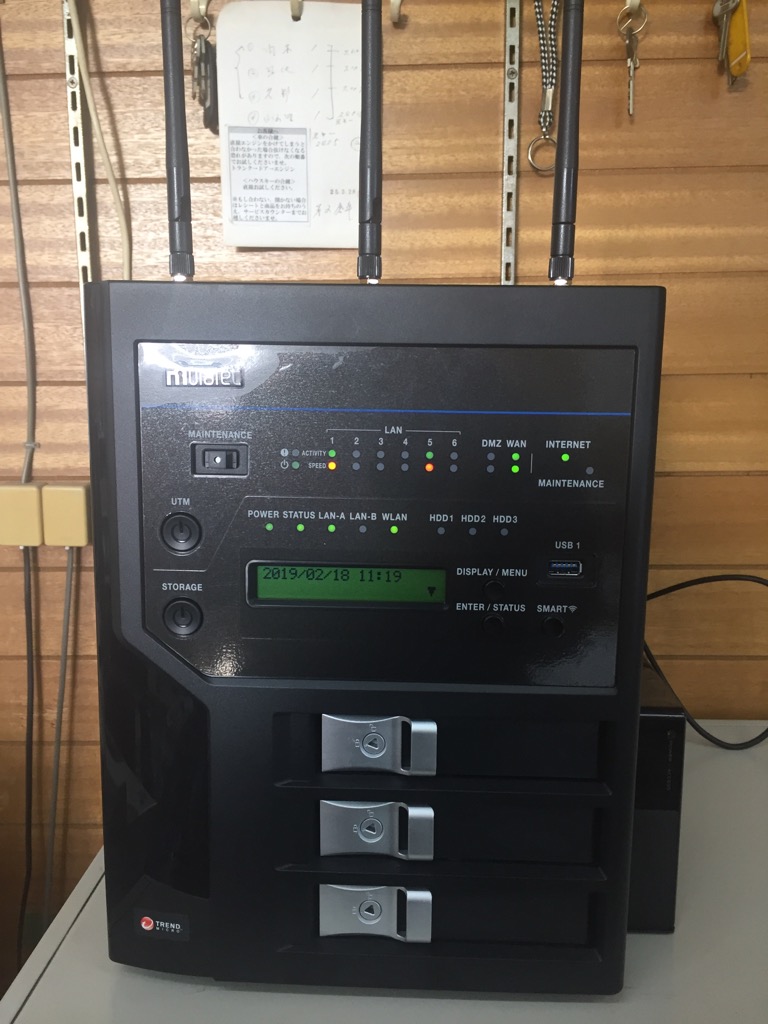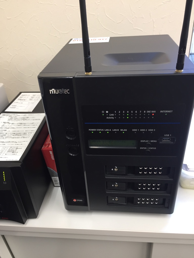 この度、今後の事業展開としてドメイン取得とホームページの新規開設・社員ごとのメールアドレス取得をご提案してご採用いただきました。 伴い老朽化してきているNAS(家庭向け)とセキュリティーを強化するためムラテック製InfomationGuardPLUSを採用していただきました。 この商品により、現場から本社データをリモートアクセスVPN機能により検索ができ、FAX着信もメールの内容確認も可能となりました。 またメーカーの電子カタログもNASからダウンロードしてお客様にご提案可能となります。もう出先に厚いカタログを何種類も持参しなくても大丈夫です。 また配線がグチャグチャでしたがすっきりとしてBACKUP体制もセキュリティ体制も整い安心して外商していただけます。 今後は経理・給与データも「セキュリティフォルダー」で完璧管理を行っていきます。まさにこの商品はS社様のために開発されたと言っても過言ではありません。 この商品は https://www.muratec.jp/ce/products/ network/informationguard-plus/