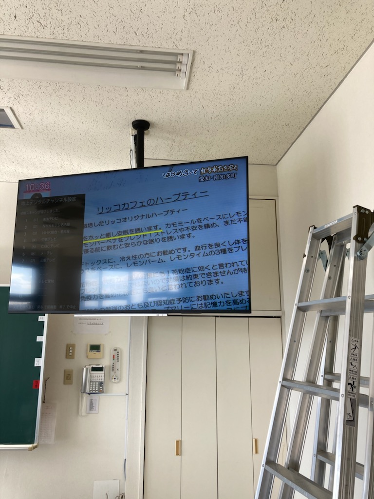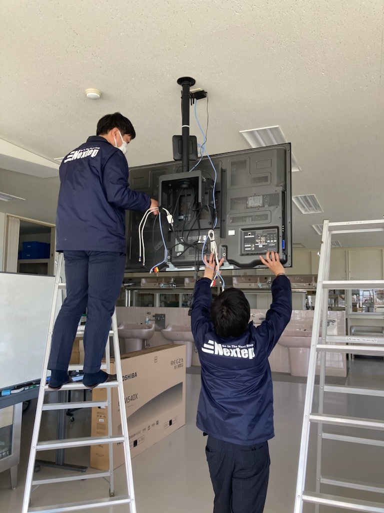 この度 全教室に於ける天吊りモニタを6式リニューアルさせていただきました。 既存の55インチを撤去し65インチ4Kタイプに交換です。 4人掛で安全を期して作業。 1台は移動式専用台に取り付けです。大型の為重量もあり大変でしたが先生方には 非常にお喜びいただきました。
