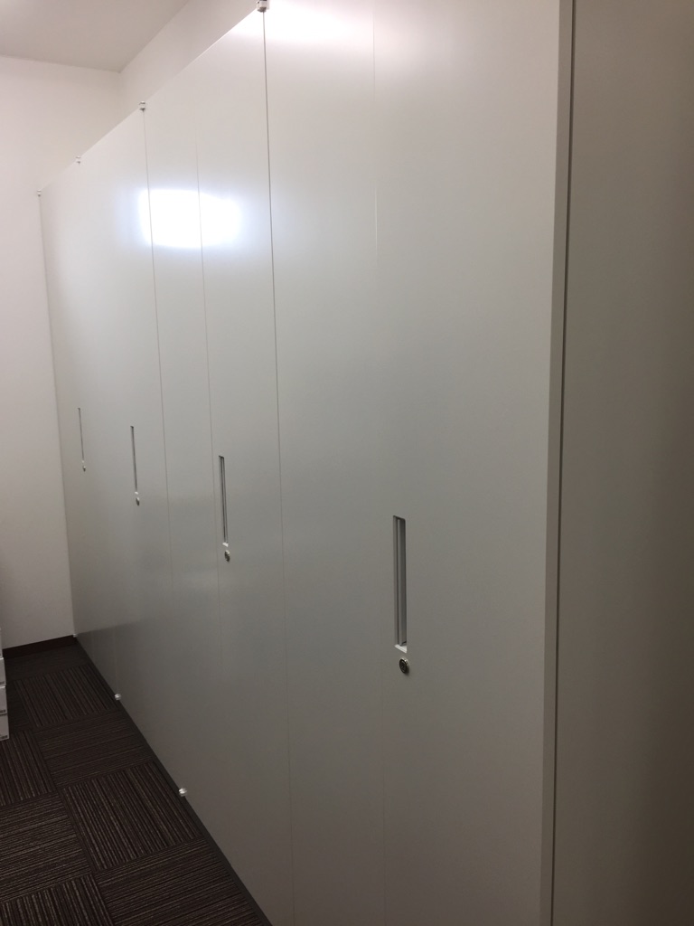 この度本社事務所内の書類保管室をリニューアルしていただきました。 H1850の両開書庫内に既存レターケースも中に収納 一面の壁のようにすっきりとなりました。