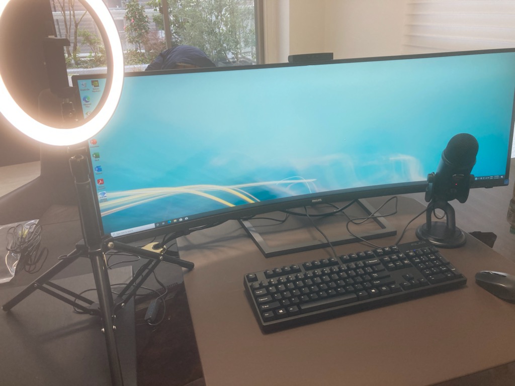 お仕事柄海外とWeb会議を頻繁に行われるとの事で、ウルトラワイドモニター(PHRIPS製)43インチと USB集音マイクとUSBLEDリングライトを設置。 社長様は英語圏の方の為Windows10はUS版にてリニューアルさせていただきました。 なんといっても大迫力のモニター!カタログで見るのと実物は圧倒的に良いと大絶賛を頂きました。 当然SSD換装済です。