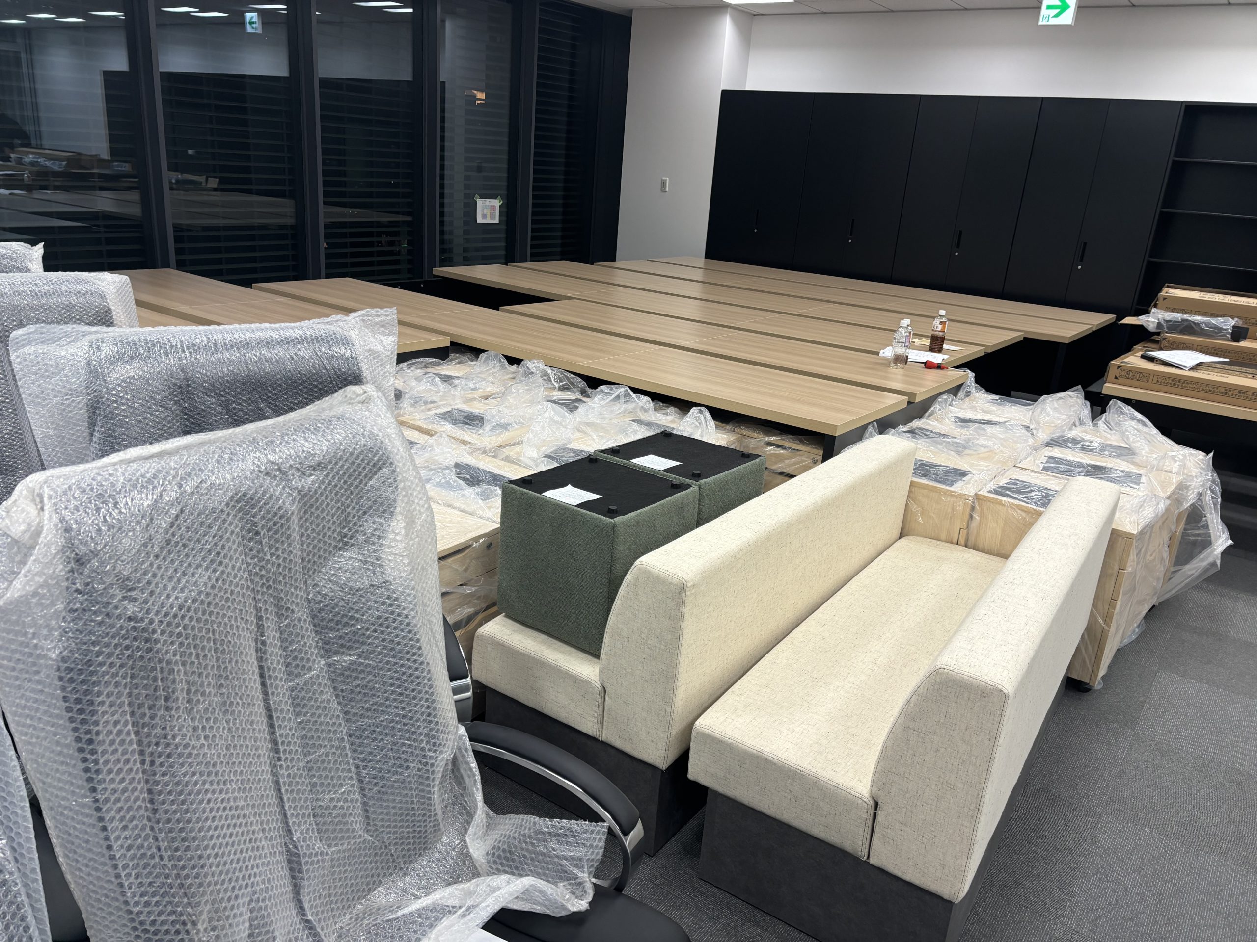 この度、事務所の移転に伴いオフィス家具一式をご用命いただきました。 今どきのフリーアドレスデスクや椅子や書庫も全て組み上げさせていただきました。 ネットの価格よりもお安くさせていただき大変お喜びいただけました。