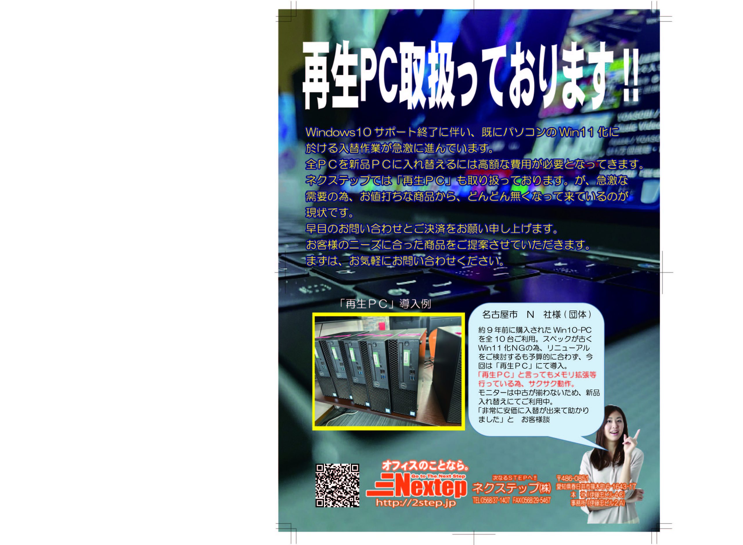 この度、弊社折込チラシをご覧いただきSSD換装をさせていただいたご縁から、事務所内PC全15台の リニューアルをさせていただきました。 ディスクトップPC/ノートPC/モバイルPC/Surface 等々用途に併せた構成ですべて納品 Office365やデータコンバートに環境設定と大変でしたが人海戦術にて半日で入れ替えさせていただきました。 従来機がWin11にアップグレードできないモデルだった為、これで安心して使用できます! 「これからは、OA機器等全てネクステップさんに任せるからお願いします!」と有難いお言葉を頂きました