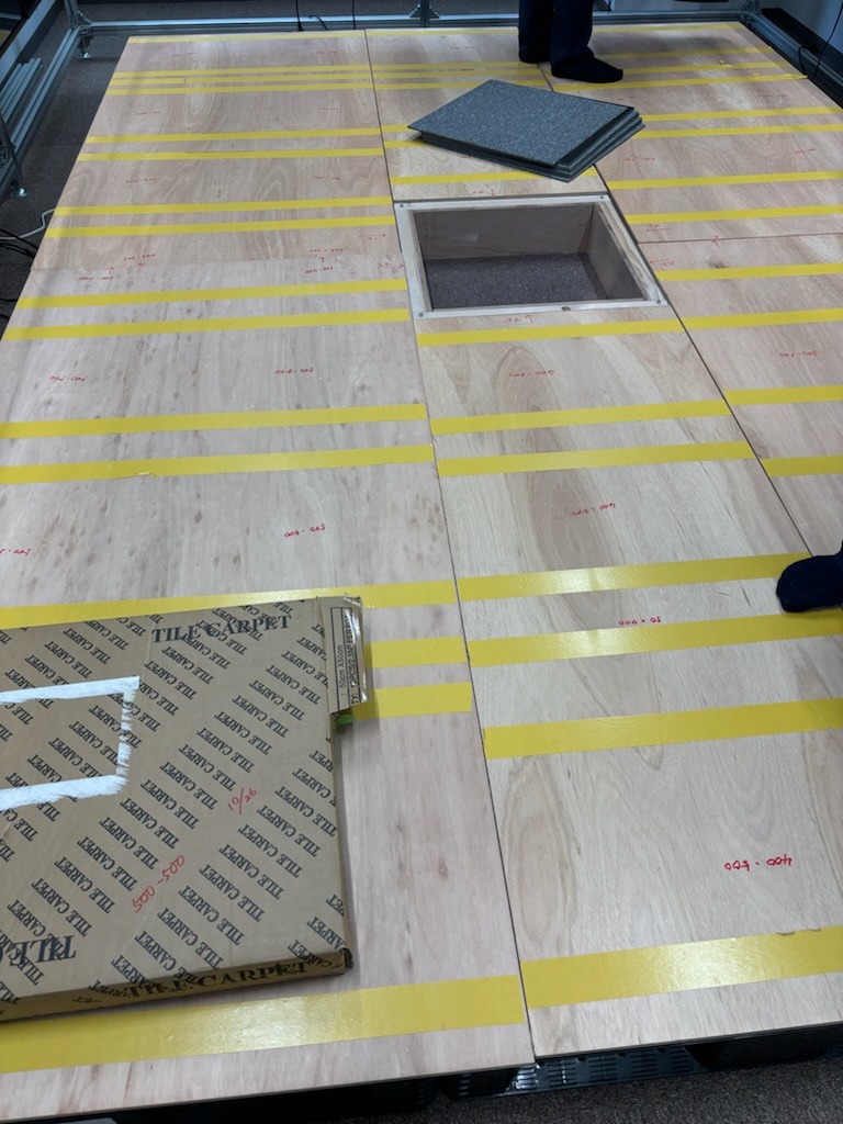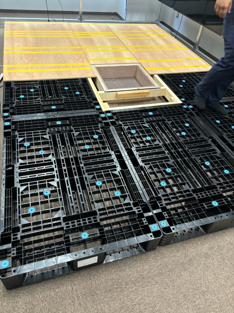 実験の為2400*3600のステージの作成依頼。しかも真ん中は透明にされたい。 バラシて再組み立てもされたい。とのご要望を賜りました。 今回はパレット8枚に真ん中はも工事で100mmのアクリル板を設計加工。 コンパネやタイルカーペットも各サイズにカット。 組み立て施工完了! 先生からも予想以上の完成度で大変お喜びいただきました。 寸法も設計通りで完璧です!!