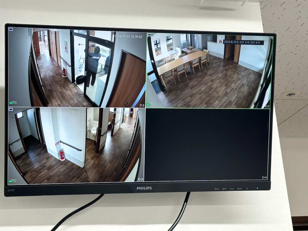 この度、ご縁を頂き介護施設様の新設事務所に防犯カメラを設置させていただきました。 3階建て全フロアに各4基づつで各フロア事務所にレコーダーと壁掛けモニターも設置。 非常に綺麗な画像にお客様も大変お喜びいただきました。 今後の運用で別事務所からネットを介して画像が見えたり、スマホからも画像確認も可能です。