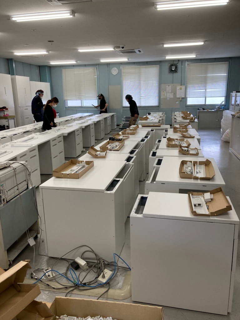 先週の書庫入れ替え搬入に引き続き、今週はデスクの入れ替え搬入です。 今回は、今後のレイアウト変更も加味してW1000片袖+ワゴンにて一人当たりW1400の作業スペースを確保。30人分の入れ替えです。 もちろん永年ご利用された既存デスクもすべて弊社にて撤去。 今回は床はそのままですが、「デスクを変えたら、事務所が非常に明るくなった!」と大変お喜びいただきました。 今後は食堂や更衣スペース等検討していただけるそうです。