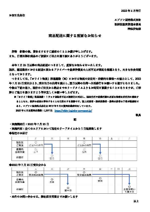 「ホワイト物流」推進に於ける当日出荷廃止のご連絡