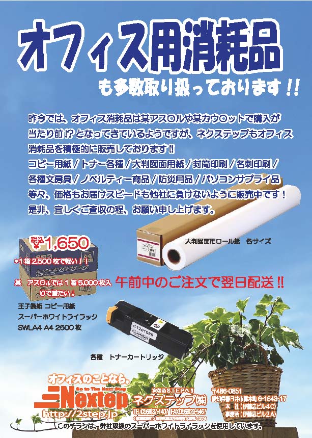 「オフィス用消耗品も多数取り扱っております!!」のチラシを配布させていただきました。